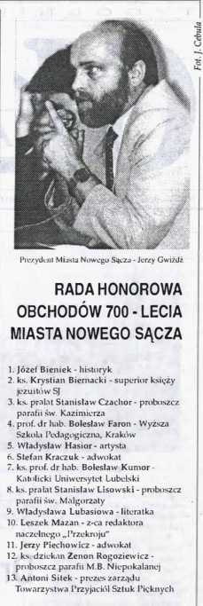 Miałem zaszczyt jako prezydent miasta a zarazem przewodniczący Obywatelskiego Komitetu Obchodów 700-lecia Nowego Sącza i wyłonionej spośród tego Komitetu Rady Honorowej, przewodzić w 1992 r. wielkim i bogatym w treści obchodom jubileuszu 700-lecia Nowego Sącza.