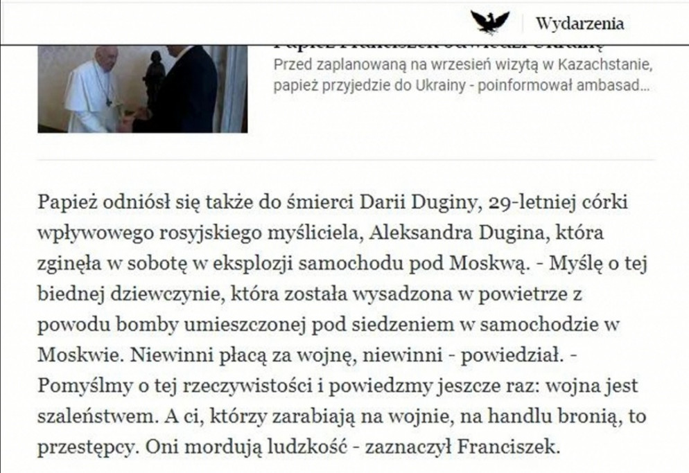 la Ukrainy raczej drugo albo i trzeciorzednym. Tylko rosyjska propaganda i służby twierdzą że ta śmeirć jest związana z wojną. A że papież to powtarza, wskazuje nam, że bezkrytycznie akceptuje rosyjski pogląd. Po drugie ta Pani była bardzo agresywnie do Ukraińców nastawioną propagandystką, która w mediach rosyjkich budowała nienawiść i nic poza tym.