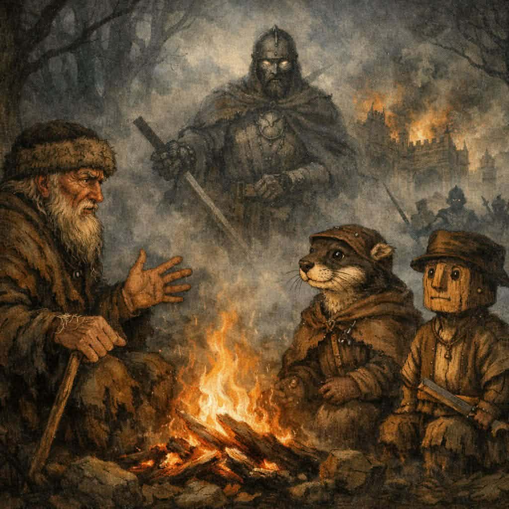 — Eee, siadajta bliżej, bo to nie jest zwykła historia — mruknął Dziad Borowy, poprawiając kapelusz. — A i ogień niech gada razem ze mną, bo on tu pamięta więcej [...]