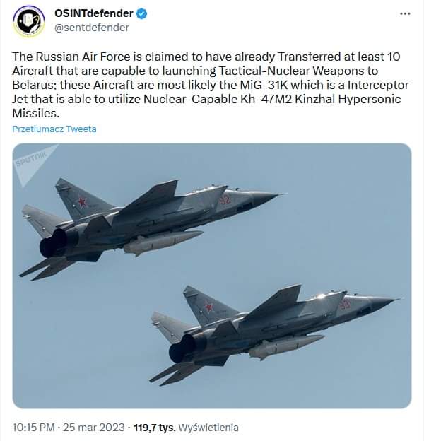 Rosjanie rozmieścili na Białorusi 10 myśliwców przechwytujących MiG-31 przysposobionych do przenoszenia hipersonicznych rakiet Kindżał z taktycznymi głowicami jądrowymi.