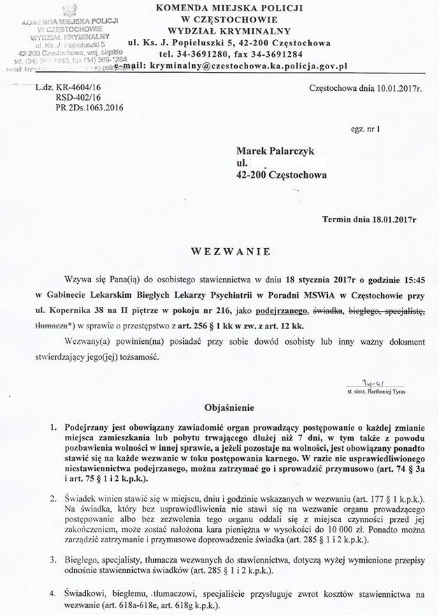 Przypominam. Rano w Święto Objawienia Pańskiego częstochowianin Marek Palarczyk został obudzony przez policję. W wyniku dokonanego przeszukania zabrano nie będący jego własnością laptop. Palarczyk jest podejrzany o czyn z art. 256 § 1 kk.