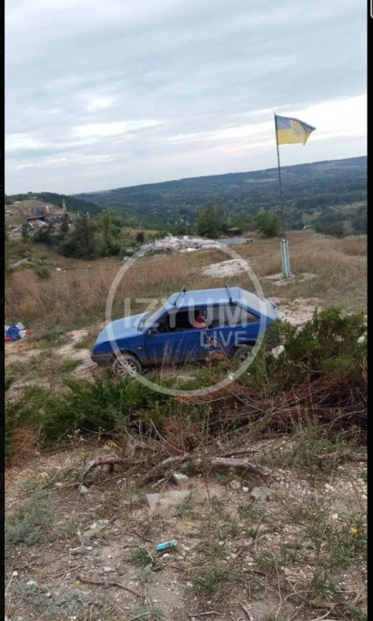 | Ukraińska flaga na wzgórzach koło Izjumu. |