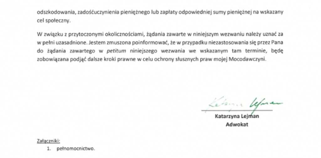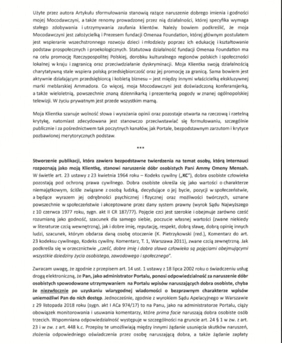 Podnosząc, że użyte przez Autora Artykułu sformułowania stanowią naruszenie dobrego imienia i godności Pani Mocodawczyni, nie wskazuje Pani jednocześnie, o które konkretnie fragmenty chodzi.