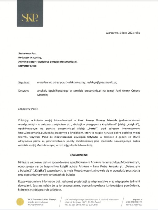 W wezwaniu wskazuje Pani, że cyt.: „Niniejsze wezwanie zostało spowodowane opublikowaniem Artykułu na temat mojej Mocodawczyni, odnoszącego się do fragmentów książki autora Artykułu – Pana Piotra Krysiaka pt. „Dziewczyny z Dubaju 2” („Książka”) sugerujących, że moja Mocodawczyni zajmowała się w przeszłości prostytucją oraz uczestniczyła w seks-wyjazdach do Dubaju”.