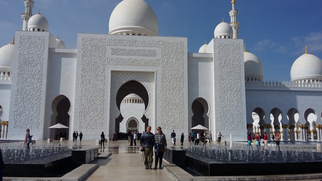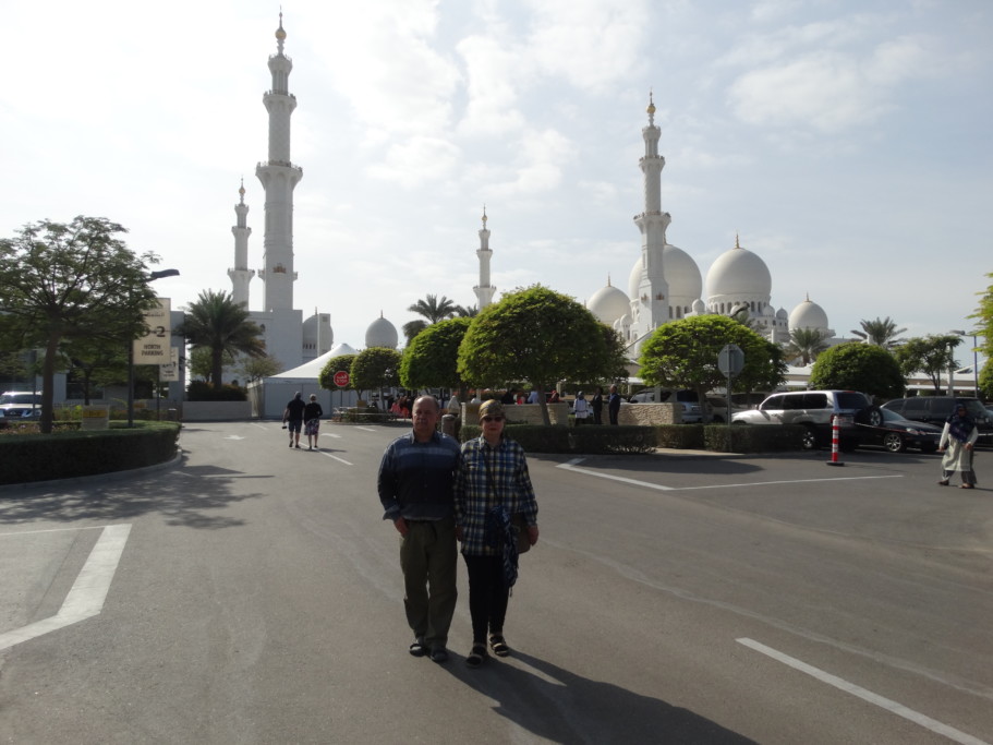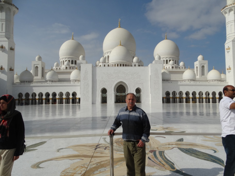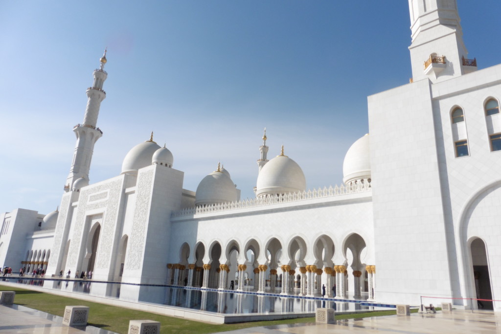 Pierwsze kroki skierowaliśmy do słynnego na cały świat meczetu Szeika Zayeda, który był inicjatorem jego budowy. Jest to najbardziej imponująca budowla w Abu Dhabi. Świątynia nawiązuje do historycznego dziedzictwa islamu i ma jednoczyć cały islamski świat. Równocześnie jest symbolem otwartości i nowoczesności Zjednoczonych Emiratów Arabskich. W ogrodach przy meczecie znajduje się miejsce spoczynku Szeika Zayeda