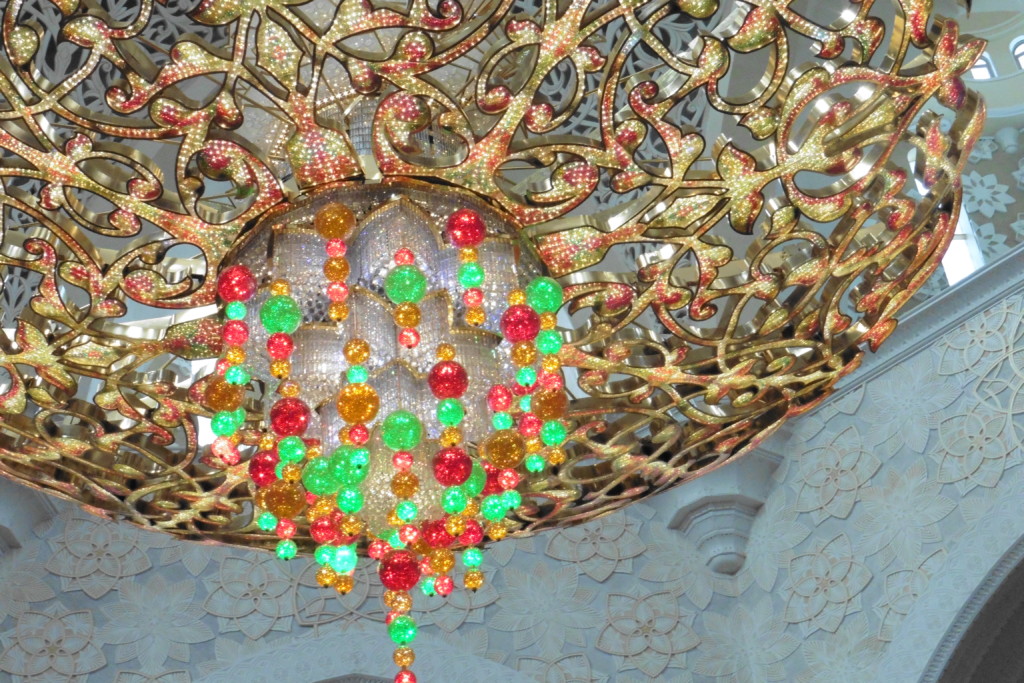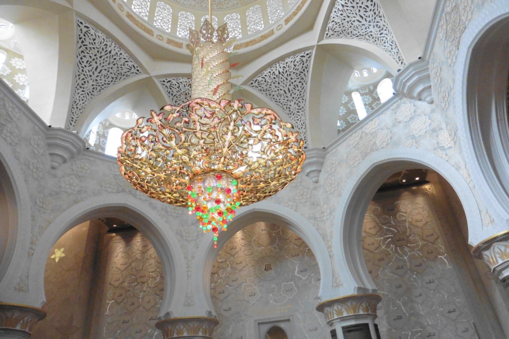 Wnętrze meczetu to arcydzieło sztuki w dosłownym tego znaczeniu. Harmonia ornamentów, kolorów i odcieni oszałamia. Wchodząc do głównej sali modlitewnej pierwsze co się rzuca w oczy to 7 ogromnych żyrandoli wykonanych z milionów kolorowych kryształów Svarovskiego. Największy z nich, wysokości 15 m, średnicy 10 m i wadze 12 ton, i jest trzecim co do wielkości żyrandolem na świecie. Dwa mniejsze ważą po 8 ton. Cztery błękitne żyrandole podobnej wielkości znajdują się w foyer. Wszystkie wykonane są z pozłacanej stali nierdzewnej i złoconego mosiądzu – do złoceń użyto 40 kg 24-karatowego złota.
