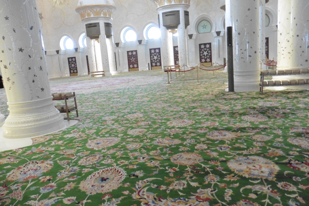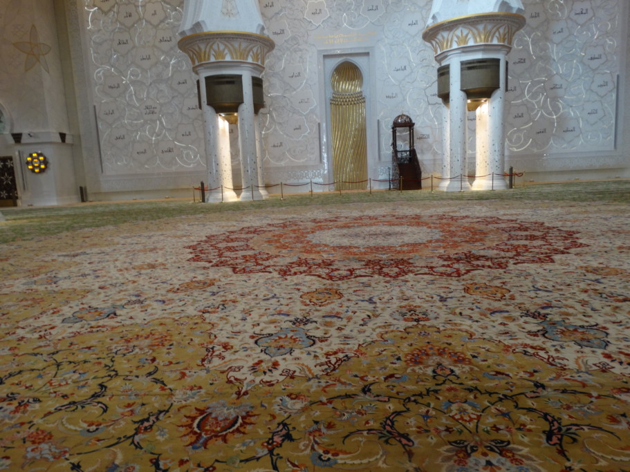 W sali znajduje się 96 marmurowych kolumn inkrustowanych macicą perłową, a podłoga świątyni przykryta jest największym na świecie ręcznie tkanym dywanem o powierzchni 5.627m2 i wadze 45 ton. Chodząc po nim nie zdawałam sobie sprawy, że składa się on z 2 mld splotów, a jego wykonanie 1200 tkaczom irańskim zajęło dwa lata.