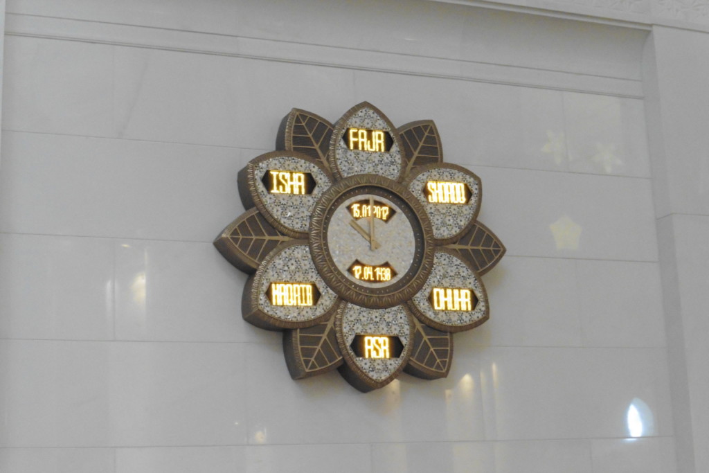 Na ścianach znajdują się rozety kwiatowe z białego złota. Jedna z rozet z imieniem Allah. Znajdujące się zegary wskazujące czas w miejscach świętych dla muzułmanów.