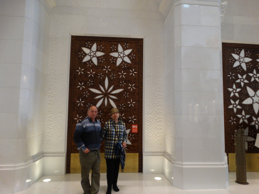 Z tego co czytałam meczet zawiera elementy zarówno starej, jak i nowoczesnej islamskiej architektury, a wygląd kompleksu nawiązuje do historycznego dziedzictwa budynków powstających w różnych, czasem odległych od siebie muzułmańskich tradycjach. Posiada oryginalny system iluminacji. Od zachodu słońca na marmurowej fasadzie i kopułach wyświetlane są błękitne falujące obłoki, których natężenie odzwierciedla fazy Księżyca. My byliśmy w dzień więc tego nie widzieliśmy. Szkoda.