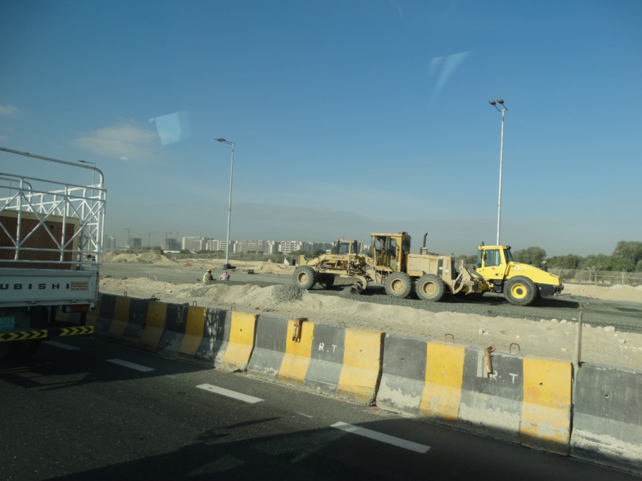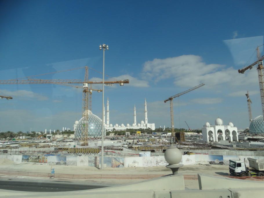 Droga z Dubaju do Abu Dhabi trwa ponad dwie godziny i jest monotonna. Jadąc 4 pasmową autostradą otoczoną palmami, obserwowaliśmy krajobraz który wyglądał jak jeden plac budowy, bowiem zarówno w Dubaju jak i w pozostałych emiratach trwa nieustająca budowa lub przebudowa. Przewiduje się budowę sztucznych wysp w kształcie łapy kraba. Większość naturalnych wysepek leży przy wybrzeżach Abu Dhabi , które w czasie przypływu zalewane są słoną wodą tworząc rozlewiska soli.