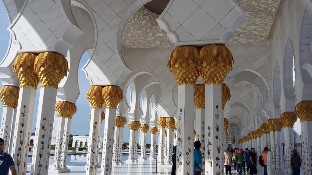 Idąc pod arkadami nie mogłam się się powstrzymać by nie dotknąć kolumn obłożonych białym marmurem i masą perłową które są przepięknie inkrustowane motywami kwiatowymi, a których kapitele (głowice) wykonano z 24-karatowego złota, podobnie jak zwieńczenia kopuł i minaretów.