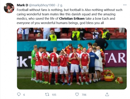 Wszelkie dywagacje na temat powrotu Eriksena są nie na miejscu. Cieszę się, że piłkarz żyje. Trzymam kciuki i modlę się by dalej było tylko lepiej i by już ani u Christiana anie na mistrzostwach nie dochodziło do tak dramatycznych chwil. Z obecnych informacji Duńczyk jest przytomny i dobrze się czuje. Trwają badania, które pomogą zdiagnozować przyczynę dramatycznych chwil podczas meczu.