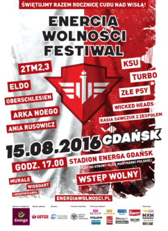 Miłosz Lodowski: Prawdziwa wolność kosztuje, a jej utrzymanie kosztuje jeszcze więcej. Nasz Festiwal dzięki wspaniałym sponsorom jest dostępny dla Was ZA DARMO. Przyjeżdżacie 15.08.2016 do Gdańska i widzimy się na Stadionie Energa Gdańsk, na placu od strony ul. Marynarki Wojennej. Koncert „Za Waszą i Naszą. Wolność…” rozpoczyna się o godzinie 17.00, ale już poprzedniego dnia rozpoczną się imprezy towarzyszące. Śledźcie energiawolnosci.pl i nasz profil na facebook’u, to poznacie pełny program Festiwalu. Bądźmy w kontakcie. Razem poczujmy moc energii wolności.