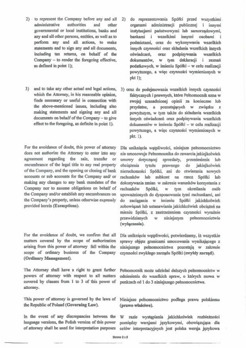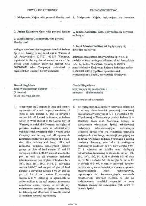 Poza rozbiórką Austriak ma również upoważnienia do „przeprowadzenia robót naprawczych, konserwacyjnych”. Jest reprezentantem Srebrnej przy „umowach projektowych, umowach zlecenia”, może decydować o zmianach umów, może je także sam rozwiązywać. Dostaje też prawo do „reprezentowania spółki przed organami administracji publicznej i innymi instytucjami państwowymi lub samorządowymi”. Pełnomocnictwo obejmuje również rozmowy z bankami.