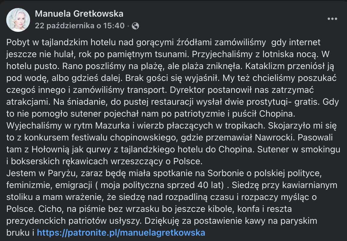 Mnie zastanawia to DLACZEGO dyrektor „wysłał dwie prostytuqi- gratis” które miały zatrzymać panią Manuelę w hotelu? Ludzie którzy prowadzą biznes szczególnie taki jak Hotel, muszą wiedzieć na czym jego gościom zależy. Żeby kogoś przekonać, jednemu postawią dobry obiad, innemu dadzą zniżkę za pokój, jeszcze innemu zafundują wycieczkę, pani Manueli zaproponowano dwie prostytutki GRATIS. Ja prosty facet, ale mimo wszystko, zastanowiłoby mnie, gdyby właściciel hotelu, zaproponował mi dwie prostytutki gratis, bo uznałbym że uważa mnie za lubieżną kutwę, i chyba bym nie uznał tego za powód do tego żeby się tym chwalić. Ale ja nie jestem Manuelą Gretkowską.