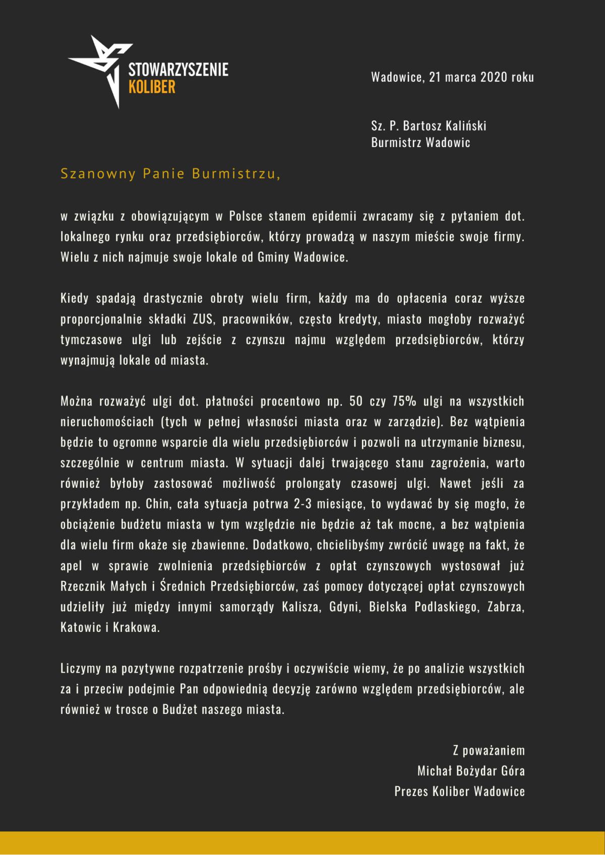 Potrzeba szybkich działań. – „W naszej ocenie w obecnym czasie takie kroki są niezwykle istotne, jeśli zależy nam na tym, aby – gdy już minie epidemia – nie zapadł się nasz wadowicki rynek handlowo-usługowy. Takie decyzje powinny być rozpatrywane przez pryzmat tego, jakie oddziaływanie mogą mieć na całe lokalne społeczeństwo i na przyszły rozwój gminy. Być może teraz budżet gminy zasilą mniejsze kwoty, ale pozwoli uniknąć to bankructw, które niewątpliwie przyniosłyby gorsze skutki, wliczając w to utratę pracy wielu osób” – stwierdza Prezes Góra.