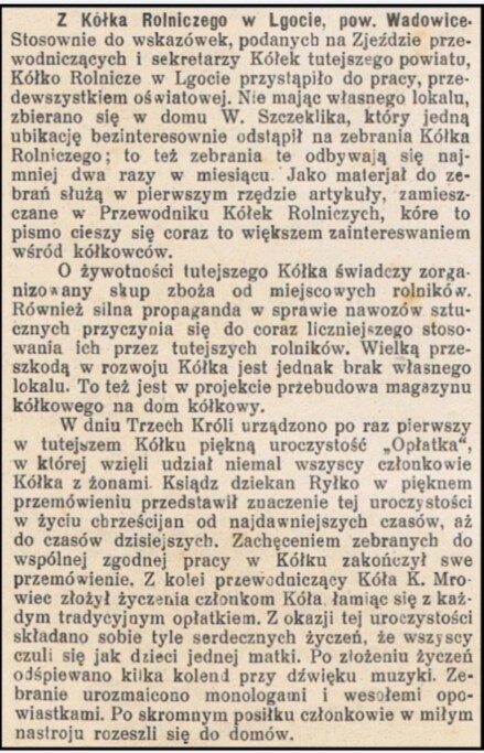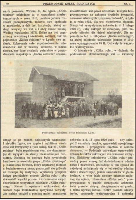 Zdjęcia: Wpis Kółka Rolniczego w Lgocie do Księgi Członków Okręgowego Towarzystwa Rolniczego w latach 1931-1937 (źródło: Oddział Archiwum Narodowego w Bielsku-Białej, sygn. 13/538/0/2/245, Okręgowe Towarzystwo Rolnicze w Wadowicach – książka członków; 1931-1937) i inne zdjęcia udostępnił do niniejszej publikacji Pan mgr inż. Ryszard Góralczyk, który jest administratorem strony internetowej „Nasza Lgota” i któremu serdecznie dziękuję.