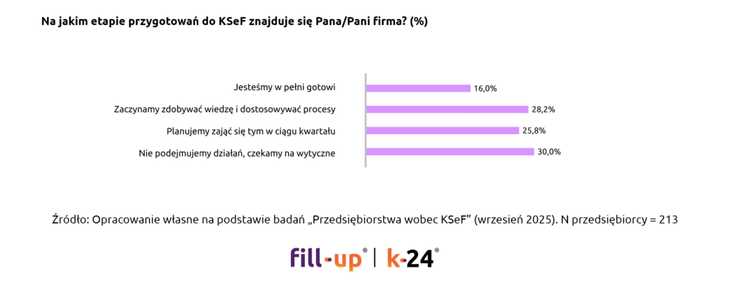 Zegar tyka, a polski biznes wciąż nie jest gotowy na KSeF. Najnowsze badanie fillup k24 pokazuje, że ponad połowa przedsiębiorców (56%) nie jest w fazie aktywnych przygotowań: 26% planuje zająć się tematem w bieżącym kwartale, a 30%… w ogóle nie podejmuje działań, czekając na wytyczne. Wyniki jasno sygnalizują, że w lutym polski biznes mogą czekać niemałe zawirowania.