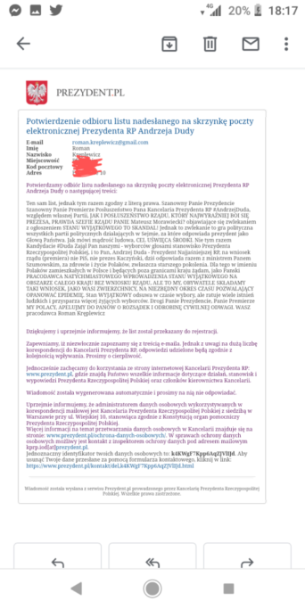 W sobotę 28 marca 2020 roku Polak, który od wielu lat mieszka w Niemczech wystosował list do Prezydenta Andrzeja Dudy i Premiera Mateusza Morawieckiego. – „W imieniu Polaków zamieszkałych w Polsce i będących poza granicami kraju żądam, jako Pański PRACODAWCA NATYCHMIASTOWEGO WPROWADZENIA STANU WYJĄTKOWEGO NA OBSZARZE CAŁEGO KRAJU” – pisze Roman Kręplewicz w piśmie przesłanym na adres Kancelarii Prezydenta RP.