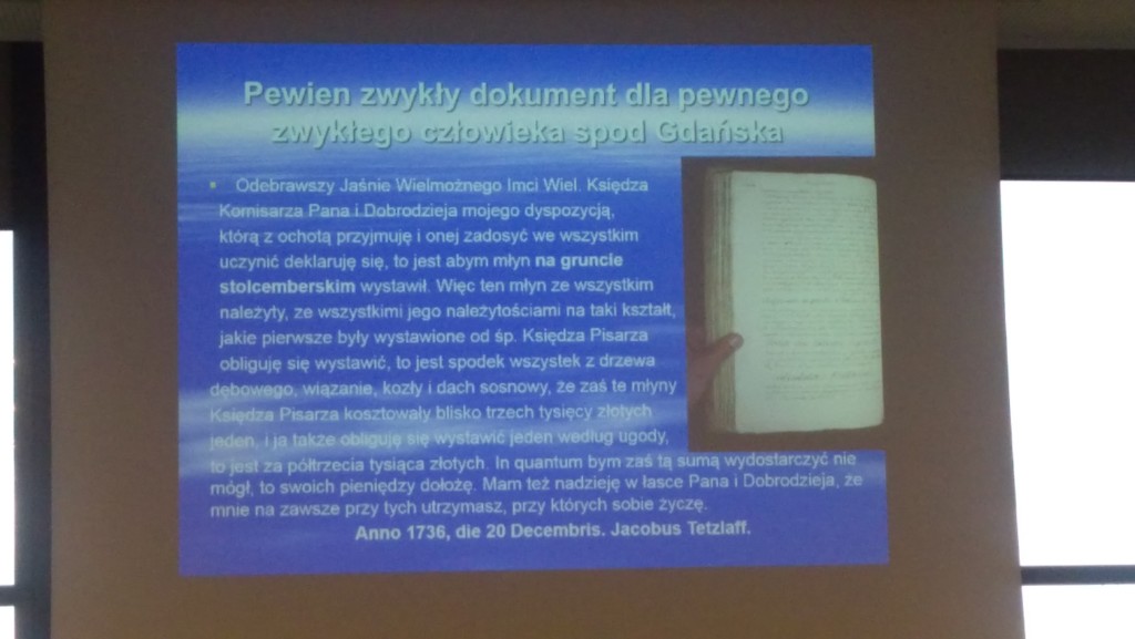 Również frapujące były przykłady dobrowolnej polonizacji nazwisk miejscowej szlachty oraz odkryty przez Profesora podczas kwerendy w gdańskim archiwum dokumentu zwykłego człowieka z 1736 roku.