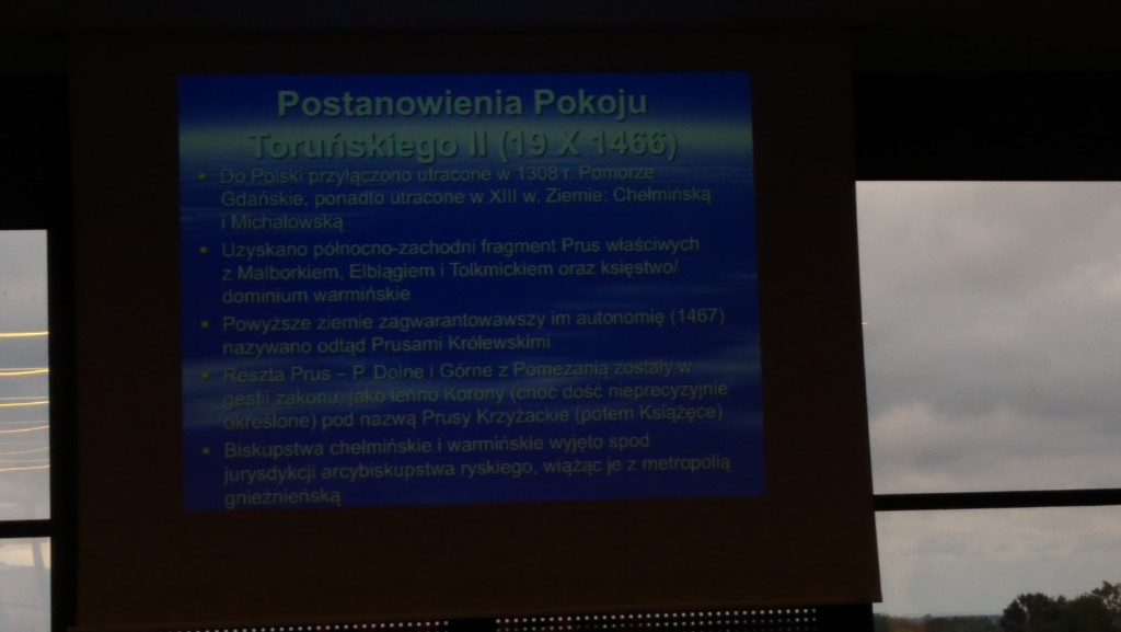Podczas godzinnego wykładu pan profesor S. Kościelniak, bardzo ciekawie przedstawił dzieje i dziedzictwo Pomorza od pokoju toruńskiego II (XV w) do rozbiorów Polski (XVIII w). Zaczął wykład od postanowień Pokoju Toruńskiego II zawartego w 19.10.1466 r. między Polską a Krzyżakami kończącego wojnę trzynastoletnią (1454-1466r). Następnie pokazał obszar Prus Królewskich oraz omówił zobowiązania Wielkiego Mistrza Krzyżackiego.