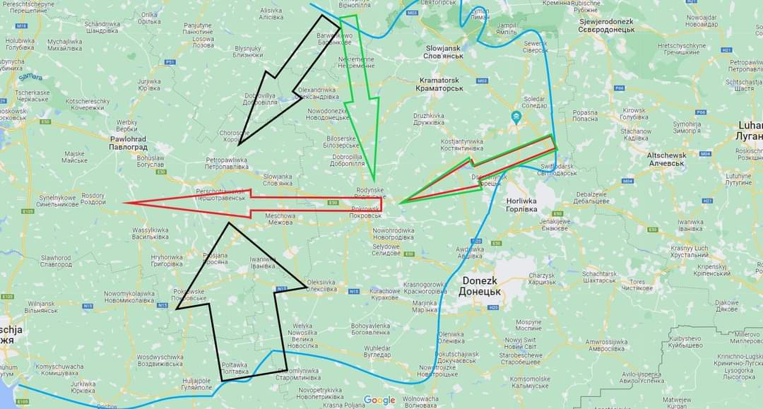 – Uderzenie na południe od Bachmutu i Konstantynowki w kierunku na Pokrowsk. Kierunek ten ma tę zaletę, że wyprowadza siły rosyjskie poza strefę umocnień ATO, a w przypadku powodzenia zroluje cały front obronny w rejonie Doniecka i zmusza ukraińskie siły zbrojne do opuszczenia rejonu Wuhłedaru. W dalszej perspektywie pozwala Rosjanom na kontynuowanie działań w kierunku na brzeg Dniepru w rejonie na południe od Dnipro, co zabezpieczy flanke 49 Armii tkwiącej pod Chersoniem i pozwoli wznowić aktywne działania w rejonie Mikołajowa. Kierunek ten wydaje się zatem szczególnie atrakcyjne w przypadku pragnienia konsekwentnej realizacji pierwotnych celów wojennych Rosji.