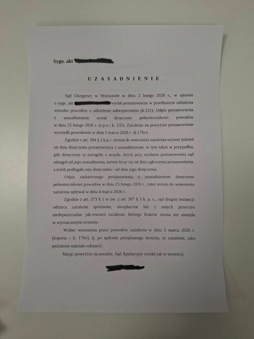 W sprawie przeciwko syndykowi Getin Noble Bank Sąd Apelacyjny odrzucił mi zażalenie w zaledwie… miesiąc. Jak to możliwe? Otóż gdy w grę wchodzi „spóźnienie” strony, maszyna rusza błyskawicznie.