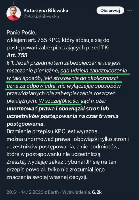 Bilewska jednak powyższe pomija. Tak naprawdę nie chodzi bowiem o prawo, ale wyrobienie w innych użytkownikach portalu X przekonania, z jakich to głupków prawnych składa się „Trybunał Przyłębskiej”…