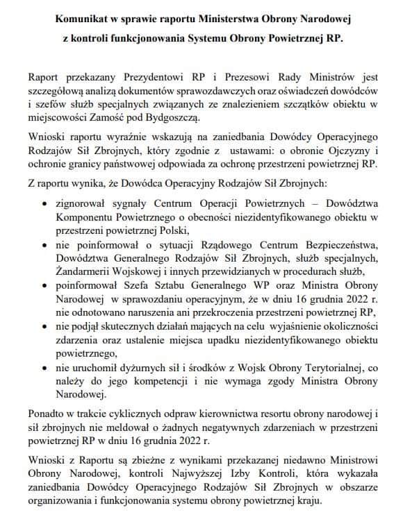 Wnioski z Raportu są zbieżne z wynikami przekazanej niedawno Ministrowi Obrony Narodowej, kontroli Najwyższej Izby Kontroli, która wykazała zaniedbania Dowódcy Operacyjnego Rodzajów Sił Zbrojnych w obszarze organizowania i funkcjonowania systemu obrony powietrznej kraju”.
