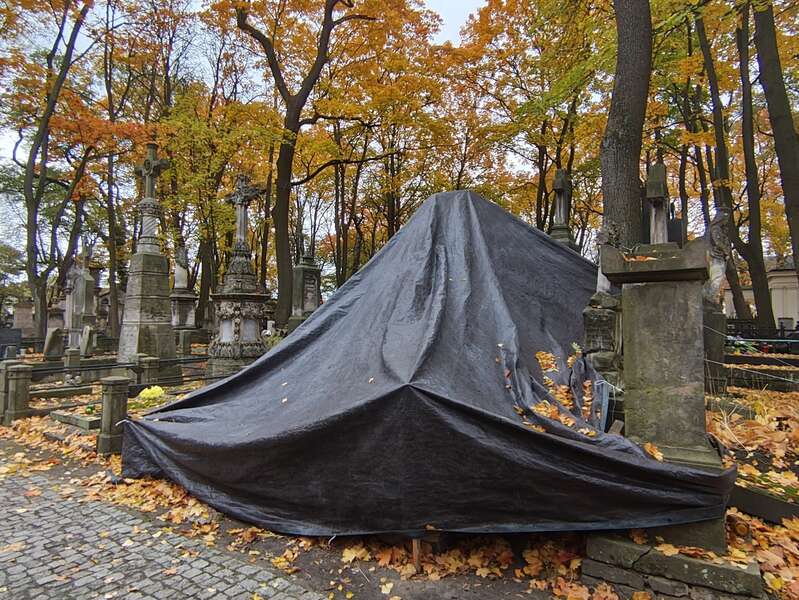 Grób jego rodziców przykryty i owinięty folią. Wyszli na chwilę, remanent.