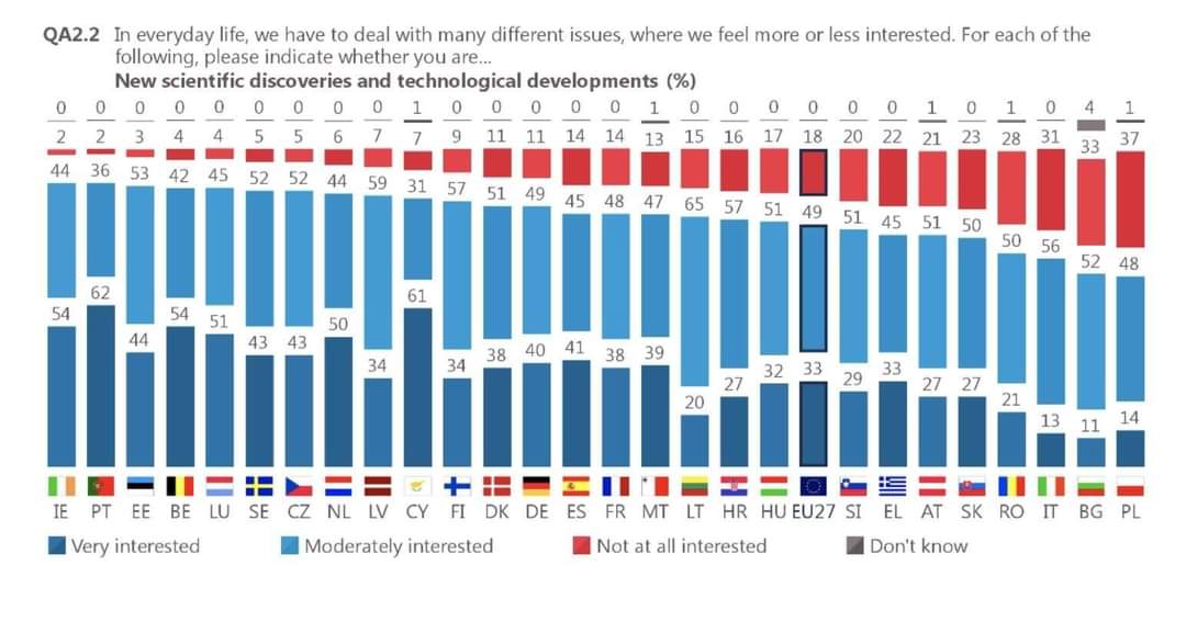 Wykres ilustruje zainteresowanie odkryciami naukowymi i rozwojem technologicznym. W Polsce najniższe w całej UE.