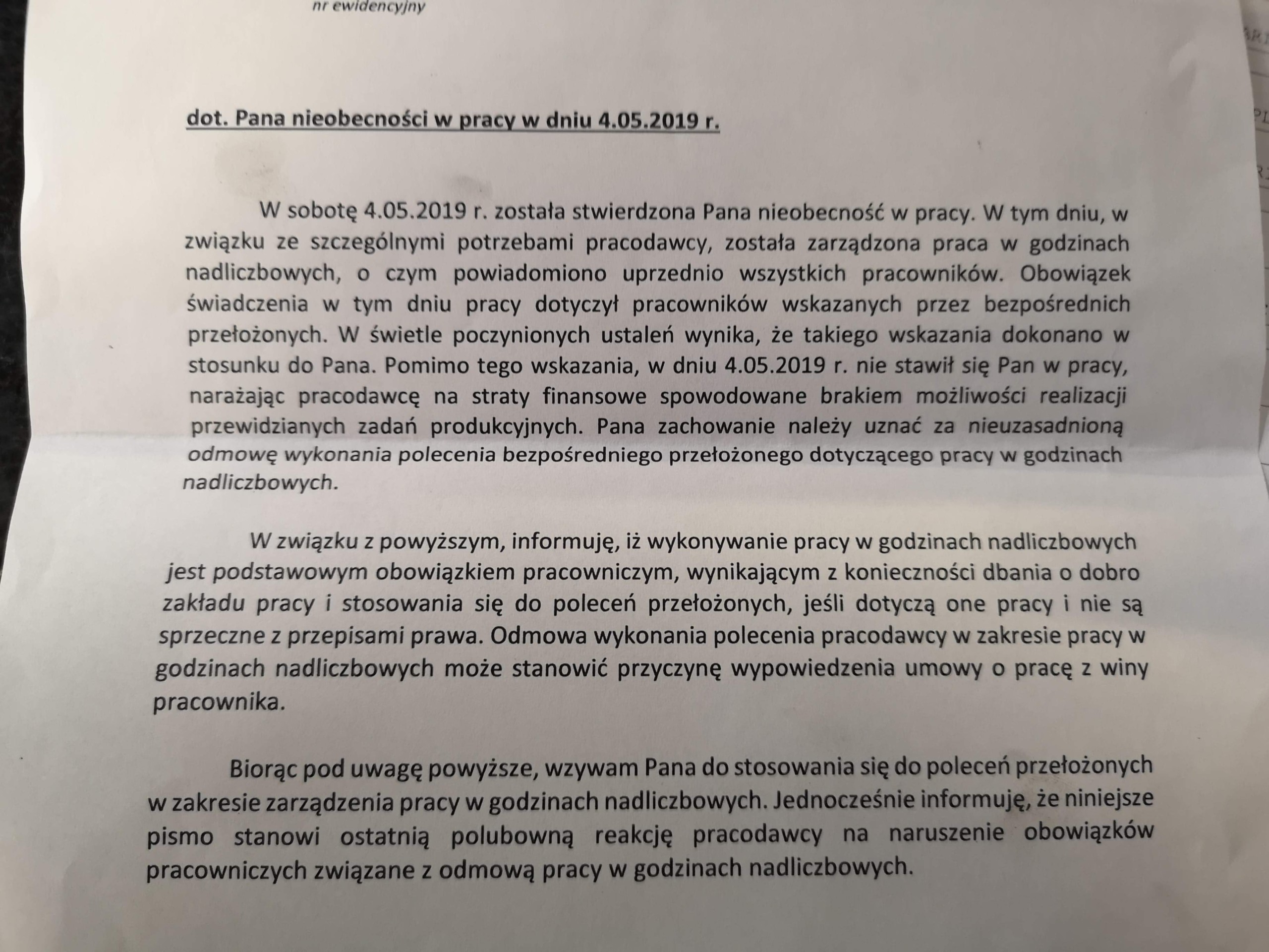 Mówi się dużo na temat zmuszania nas do sobót. Głosy z zewnątrz krzyczą, że to wbrew prawu, że pozwalamy sobie na takie traktowanie. Ale zacznijmy od początku. W tamtym roku tj. 2019 okazało się, że nie będziemy mieć wolnej majówki, bo w sobotę pracujemy. Wśród załogi powstał nieplanowany bunt. Jak domino kolejne brygady, czy nawet całe odcinki zgłaszały, że do pracy w sobotę nie przyjdą. Po burzy mózgów stwierdziła góra, że będzie pracować jedna zmiana. Liderzy przeszli po załodze z pytaniem czy pracownicy wesprą produkcję w sobotę. Część ludzi się zgodziła, reszta definitywnie powiedziała nie. Suma, summarum dyrekcja postawiła na swoim i pracowaliśmy. Po dwóch tygodniach po feralnej majówce pracownicy, którzy odmówili pracy w sobotę dostali pismo. Załoga wystraszona, zniesmaczona pozostawiona samym sobie straciła chęci do walki. Poniżej dołączam pismo od dyrekcji.