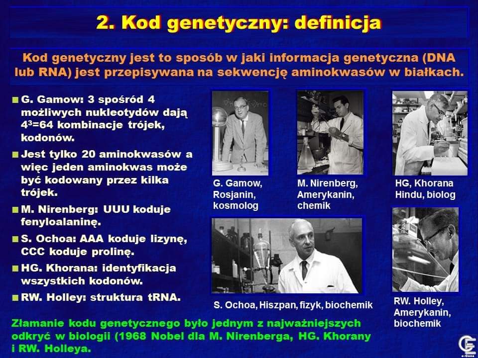 W czym leży problem z kodem genetycznym? Ano w powszechnym myleniu kodu genetycznego z informacją genetyczną. Kod genetyczny jest to sposób w jaki informacja genetyczna zawarta w kwasie nukleinowym (DNA lub RNA) jest przepisywana na sekwencję aminokwasów w białku. Innymi słowy, jest to pewna reguła jak odczytać to co jest zapisane w materiale genetycznym. Podobnie alfabet Morsa określa co oznaczają poszczególne znaki, a kod Enigmy ustalał regułę szyfrowania i następnie odczytywania informacji. Kod genetyczny został „złamany” w latach 60-tych ubiegłego wieku, za co trzej badacze, M. Nirenberg, HG Khorana i RW Holley otrzymali nagrodę Nobla w 1968 r. (rys. 1)