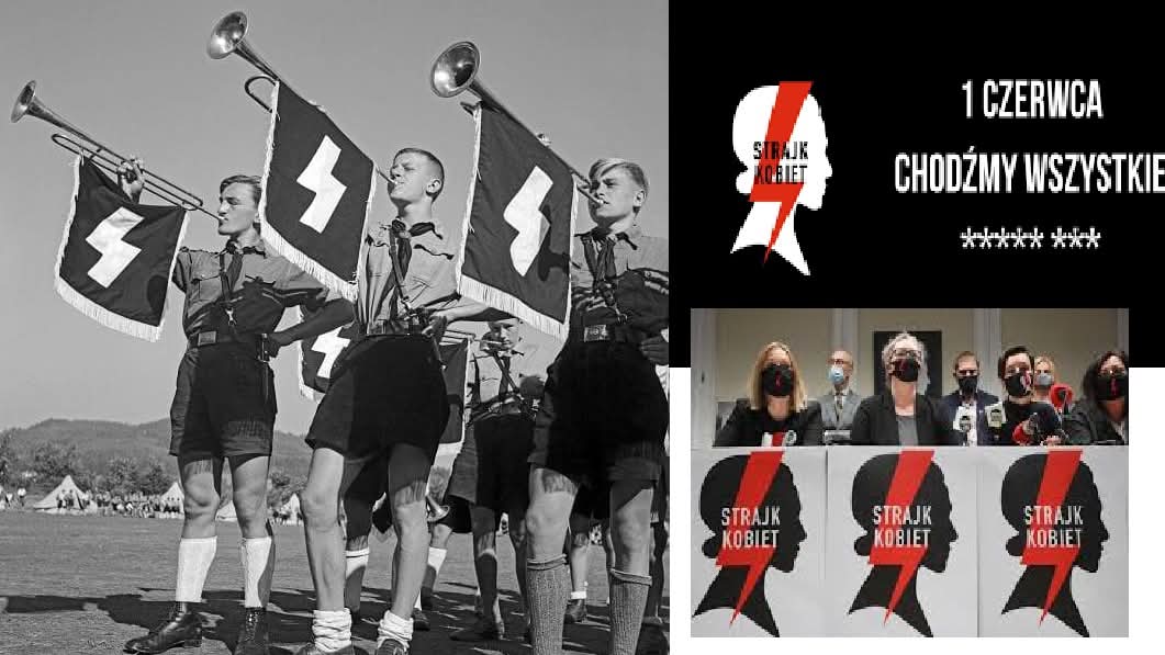 „Naziole” jako swój symbol przyjęli znaki runiczne w kształcie błyskawicy/pioruna. Taki sam znak mają uczestniczki tzw. strajków kobiet. Nikt jednak w Brukseli nie mówi, że na tych marszach kroczyły tysiące nazistek.