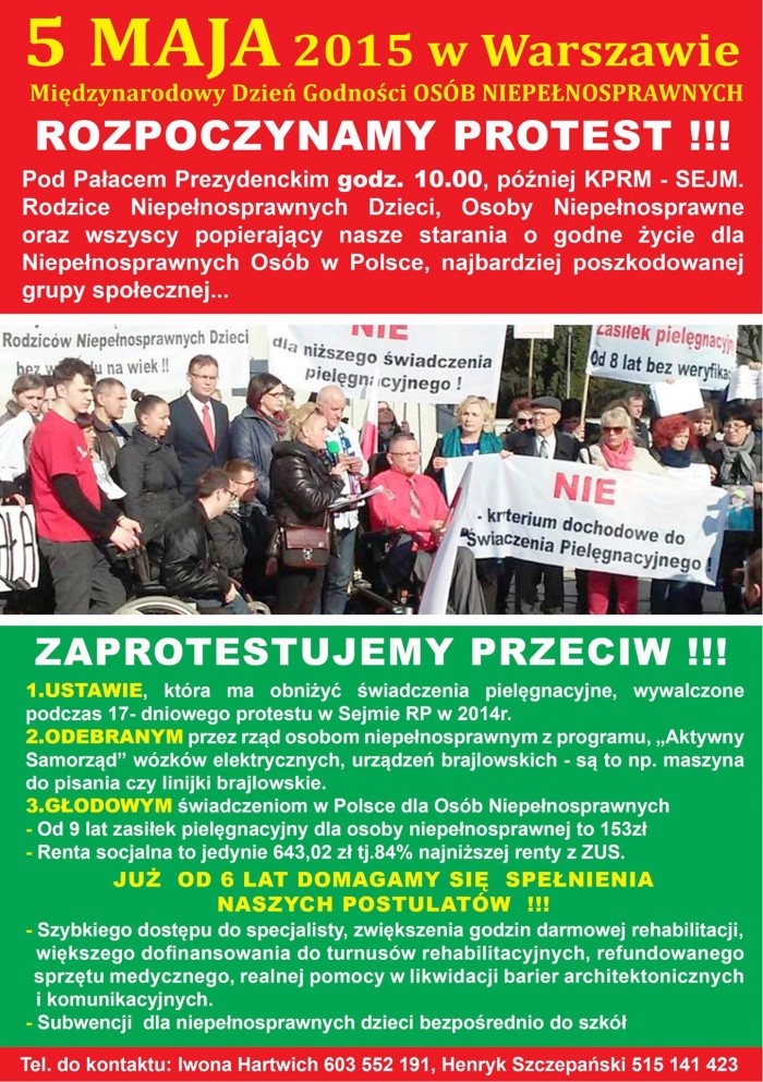 5 maja 2015 r. Rodzice, Opiekunowie niepełnosprawnych kolejny raz pojadą do Warszawy, by zamanifestować swój bunt wobec ekipy rządzącej, która stała się głucha, ślepa na wsparcie grupy najsłabszej. Pojadą, by upomnieć się o godność dla swoich niepełnosprawnych bliskich.