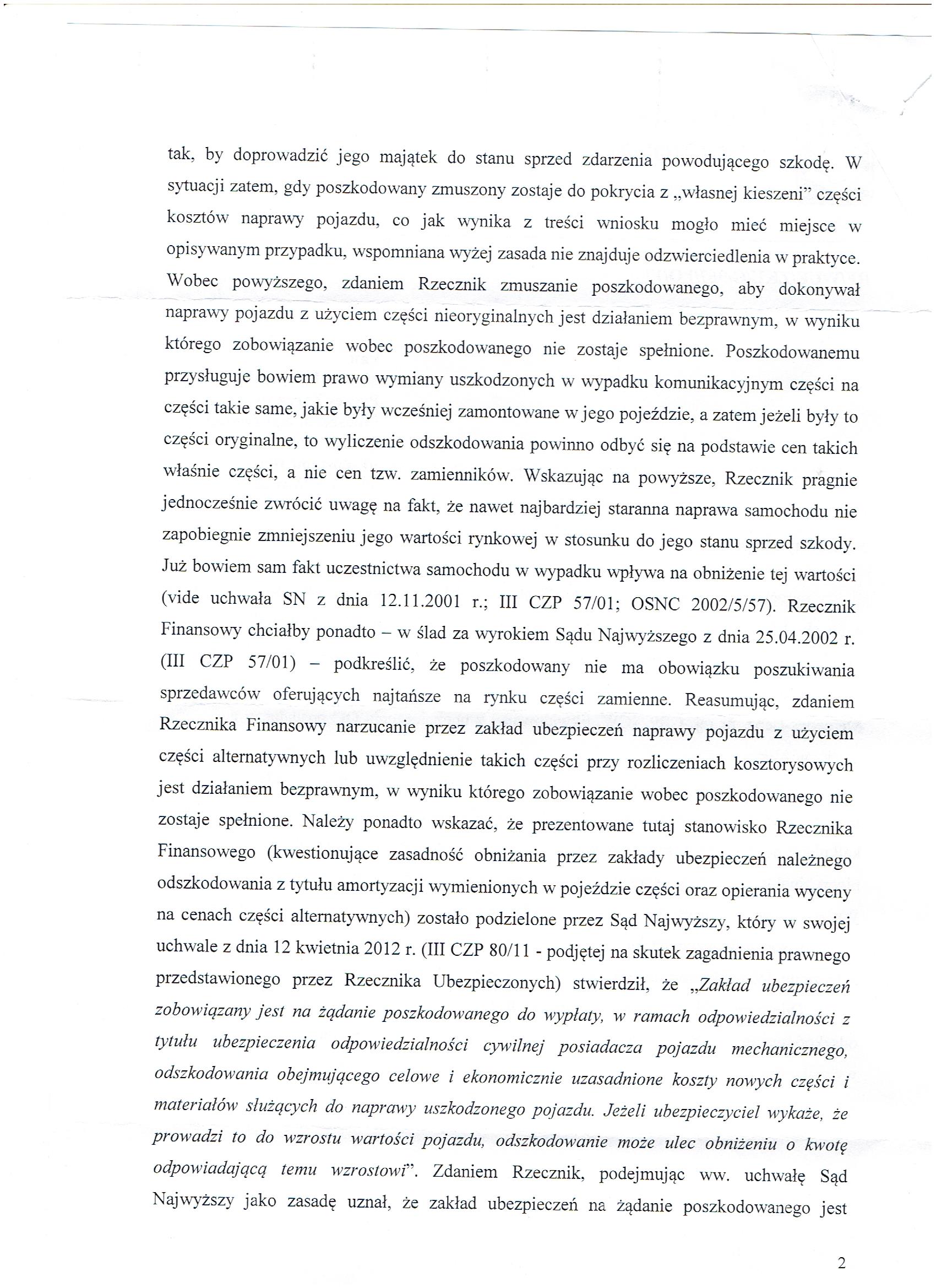 W przypadku, gdyby PZU wykazał, iż uszkodzeniu uległy części zakupione przed szkodą na rynku wtórnym, byłyby to tzw. zamienniki bez logo producenta zamontowane przez poszkodowaną uzasadnienie PZU miałoby znaczenie prawne. W tej sytuacji bez dowodu został naruszony choćby art. 6 KC.