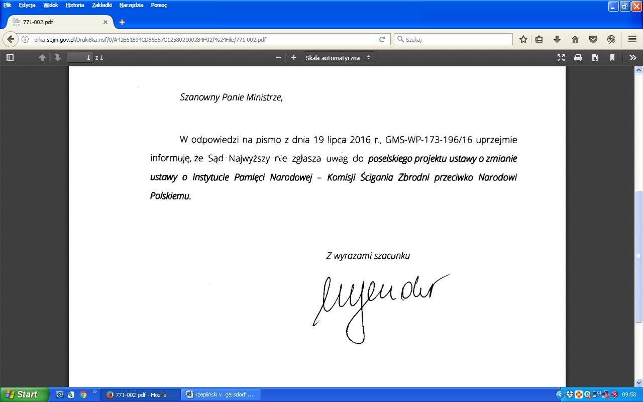 Tymczasem nowela z dnia dodająca do ustawy o IPN nowy art. 55a penalizujący zachowanie polegające na pomawianiu Narodu Polskiego o niepopełnione przez niego zbrodnie już w 2006 roku doczekała się pozytywnej opinii Sądu Najwyższego, pod którą podpisała się prof. Małgorzata Gersdorf, pierwszy Prezes SN.