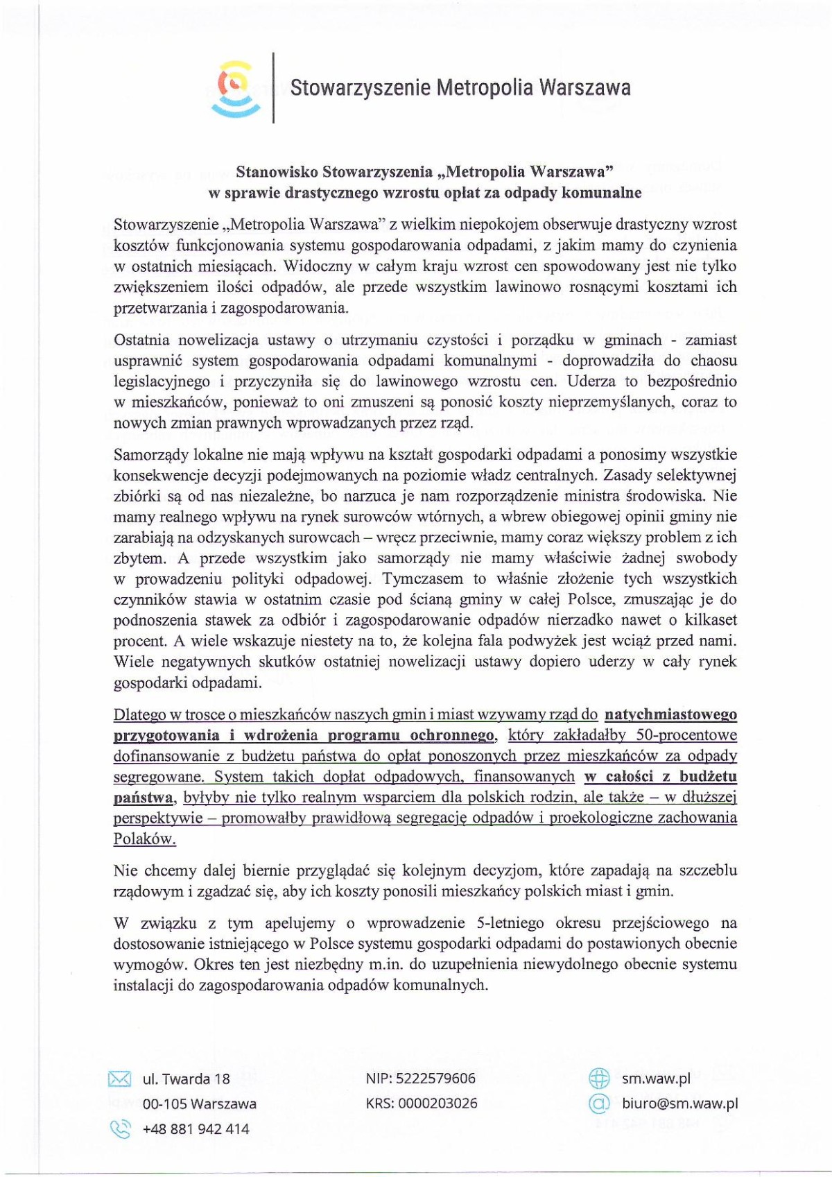 „W trosce o mieszkańców naszych gmin i miast wzywamy rząd do natychmiastowego przygotowania i wdrożenia programu ochronnego, który zakładałby 50-procentowe dofinansowanie z budżetu państwa do opłat ponoszonych przez mieszkańców za odpady segregowane. System takich dopłat odpadowych, finansowanych w całości z budżetu państwa, byłby nie tylko realnym wsparciem dla polskich rodzin, ale także – w dłuższej perspektywie – promowałby prawidłową segregację odpadów i proekologiczne zachowania Polaków” – czytamy w stanowisku SMW.