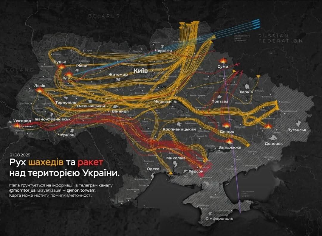 Małą liczbę ofiar zawdzięczamy doskonałemu monitoringowi lecących dronów i rakiet (mapka), jak i pracy jednostek obrony powietrznej. Dzisiejszej nocy Ukrainę atakowało w sumie 546 dronów i 31 rakiet różnego rodzaju, w tym 3 kasetowe lecące na Lwów.
