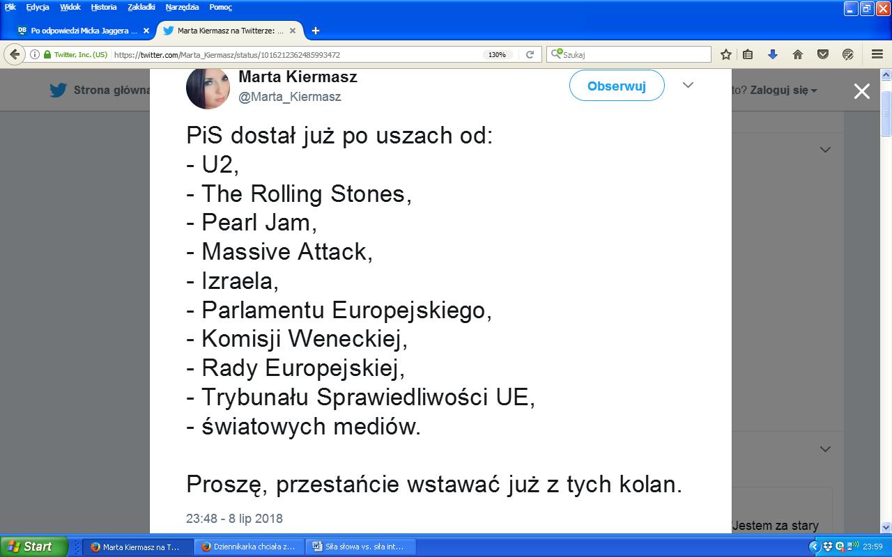 Również początkująca żurnalistka Marta Kiermasz w słowach Jaggera doszukała się… potępienia PiS: