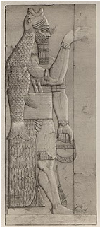 Największym zainteresowaniem badaczy cieszy się rzeźba zwana Postać z rybą. Interpretacje tej rzeźby wywołują najwięcej dyskusji. Jest to najwyraźniej postać męska w długiej szacie, trzymająca oburącz ogromną rybę. Motyw ryby posiada od bardzo dawnych czasów specjalne znaczenie kultowe. Kult ten sięga korzeniami do starej kultury sumeryjskiej w Mezopotamii, gdzie bóstwo symbolizuje żywioł wodny Ea. Legendy Sumerów mówią o bliżej nieokreślonej rasie pół ryb, pół ludzi, którzy przypłynęli w górę rzeki z bogiem Oannesem inaczej Enki na czele. Nauczali oni ludzi sztuki pisania, budowania miast, uprawy roli i wykorzystania metali. Ea nie jest pochodzenia sumeryjskiego, został przez nich przemianowany na Enki. Zresztą wiele miast sumeryjskich jest pochodzenia przedsumeryjskiego należącego do kultury El Obeid. Sumerowie i Babilończycy uważali, że ich cywilizację założyła grupa istot zimnowodnych. Przewodnikiem tej grupy był Oannes, a właściwie Ea, gdyż imię Oannes zostało zhellenizowane przez historyka Berossosa. Pojawia się on pod postacią boga ryby.