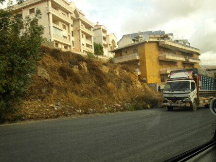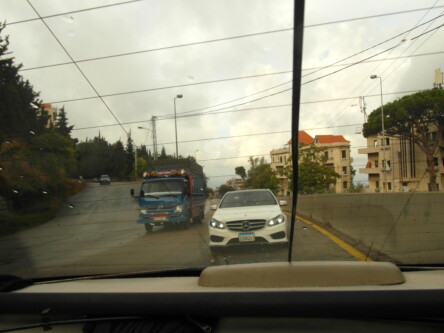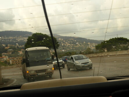 Wpakowali nas do białego Hyundaia Azera i rozpoczęła się wspinaczka. O ile część Bejrutu leży na poziomie morza, to te peryferia już na wzgórzach. Przed nami 130 km i od zera do 1500 m. nad poziomem morza. Widoki nieszczególne z samochodu, siedzimy nisko, betonowe obrzeża drogi zasłaniają widok, a mgła i deszcz swoje robią. Ale gdyby tak gdzieś wyskoczyć na pobocze, albo wspiąć się na murek byłoby co podziwiać.