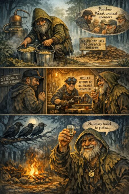 Wszak, w goglach i z iskrzącą spawarką w ręku, pochylony był nad kolejną absurdalną konstrukcją. Na tablicy widniał dumny napis: „PROJEKT: AUTOMAT DO NALEWANIA KOMPOTU”.