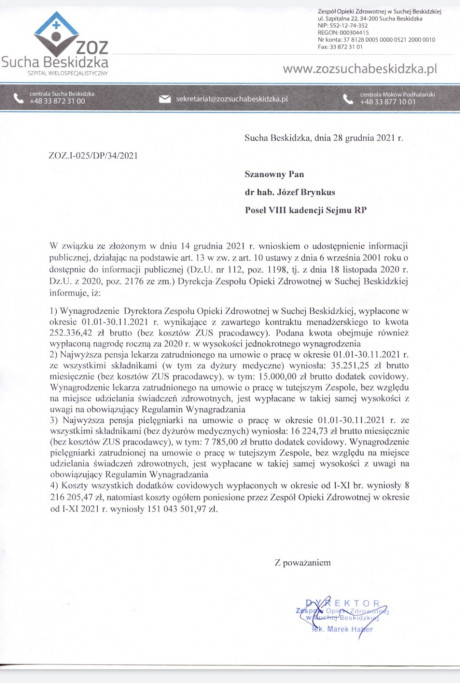 – wnoszę również o udzielenie informacji dotyczącej tego – jaką kwotę w suskim szpitalu podlegającym starostwu powiatowemu w Suchej Beskidzkiej przeznaczono na wszystkie dodatki covidowe i jaka była suma wszystkich wydatków szpitala w tym okresie – tj. od 1 stycznia 2021 roku do 30 listopada tegoż roku.