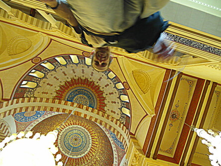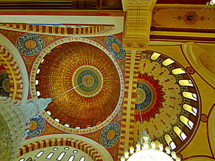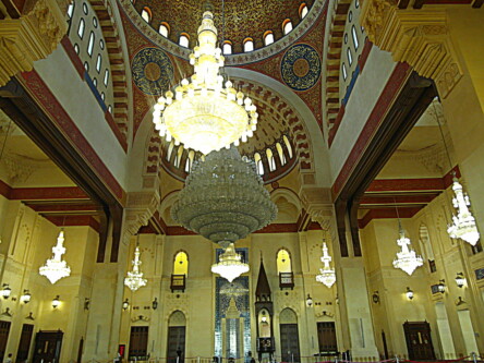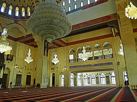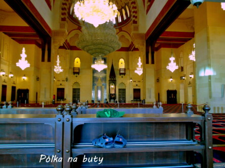 Ogrom przestrzeni, żyrandole wielkości Małego Fiata. Wiara muzułmańska zabrania przedstawiania wizerunków ludzi i zwierząt. Są więc kwiatki, listki, albo wzory geometryczne, stąd nazwa takich kompozycji arabeski. W tym meczecie nawet tego nie za dużo.