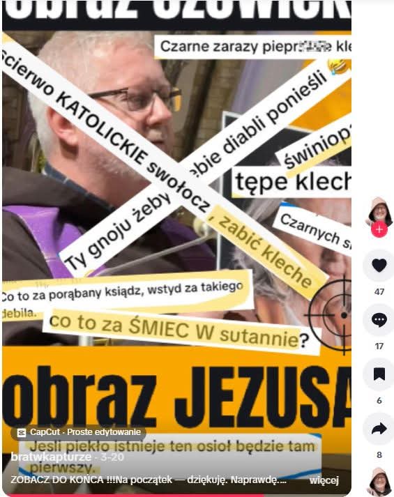 2. Mój brat zakonnik po rekolekcjach za materiał z tych rekolekcji został zaatakowany hektarami ponad 300 wpisami, niby od ludzi: „zdychaj klecho” , „zabić kleche” itd. Sprawdziliśmy w 90% boty ale ktoś nimi steruje – tu nie ma żadnych blokad takich kont mimo, że dostawcy platform technologicznie mogą je wycinać z automatu. Pozytyw taki, że mój brat po chwilowym zwątpieniu w świat napisał bardzo dobry utwór, przekształcony w piosenkę. Gdy będzie wersja pełna, też go zamieszczę.