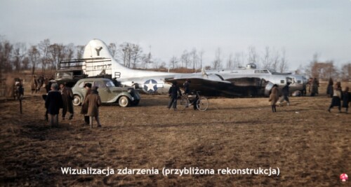 A potem, kiedy samolot już leżał na ziemi i ucichł ostatni zgrzyt metalu, historia nagle odsłoniła swoją najbardziej ludzką twarz. Lotnicy, działając według procedur, zdążyli jeszcze zniszczyć mapy i celownik bombardierski, jakby chcieli odciąć ostatni ślad wojny, zanim ta dopadnie ich na ziemi. A zaraz potem zobaczyli ludzi z okolicznych domów, którzy przybiegli na miejsce katastrofy — z ciekawości, z niepokoju, może z odruchem pomocy. I w tych pierwszych minutach wydarzyło się coś, co zostaje w pamięci bardziej niż wszystkie raporty: amerykańscy lotnicy częstowali mieszkańców sucharami i czekoladą. Drobny gest, a jednak mocniejszy niż niejeden patetyczny opis. Bo pokazuje, że nawet pośrodku wojny, wśród dymu i strachu, człowiek potrafi na chwilę pozostać po prostu człowiekiem.