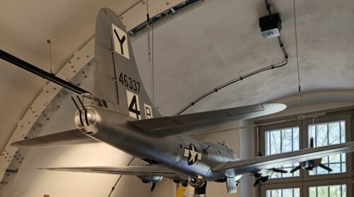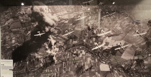 I teraz proszę spojrzeć: w tych dwóch gablotach widzimy samolot zwiadu fotograficznego — P-38 Lightning — nad zakładami w Blachowni Śląskiej, a dalej model B-17. A pod nim — porzucone czołgi i ciężarówki. Dlaczego? Bo po pierwsze: wywiad krajowy***  rozpracował niemiecką produkcję benzyny syntetycznej metodą Friedricha Bergiusa. Alianci dostali informację: ogarnijcie się, Niemcy robią benzynę z węgla — i to nie w laboratorium, tylko na pełną skalę. Po drugie: zwiad lotniczy to potwierdził. Po trzecie: generał Dwight Eisenhower zdecydował, że wszystkie dzienne bombardowania amerykańskie po Normandii mają iść w niemiecki przemysł petrochemiczny. Zatem alianci w ramach operacji Pointblank — proszę zapamiętać tę nazwę — postanowili uderzyć właśnie w paliwo. Bo jak się odetnie paliwo, to cała machina wojny staje.