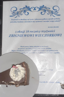 Najpierw kawałek tortu z płonącą świeczką oraz dyplom otrzymują ci, którzy mają okrągłe rocznice zerwania z nałogiem. Ja mam dychę. Na początku przyszłego roku taką samą okrągłą rocznicę będzie miała Lila. Wytrzeźwieliśmy razem. Nam się udało. A ile w ostatnich latach było pogrzebów tych, którym się nie udało? Przestałem ich prostować, tracić czas i energię. Chcesz to pij, widocznie swojego nie wypiłeś.