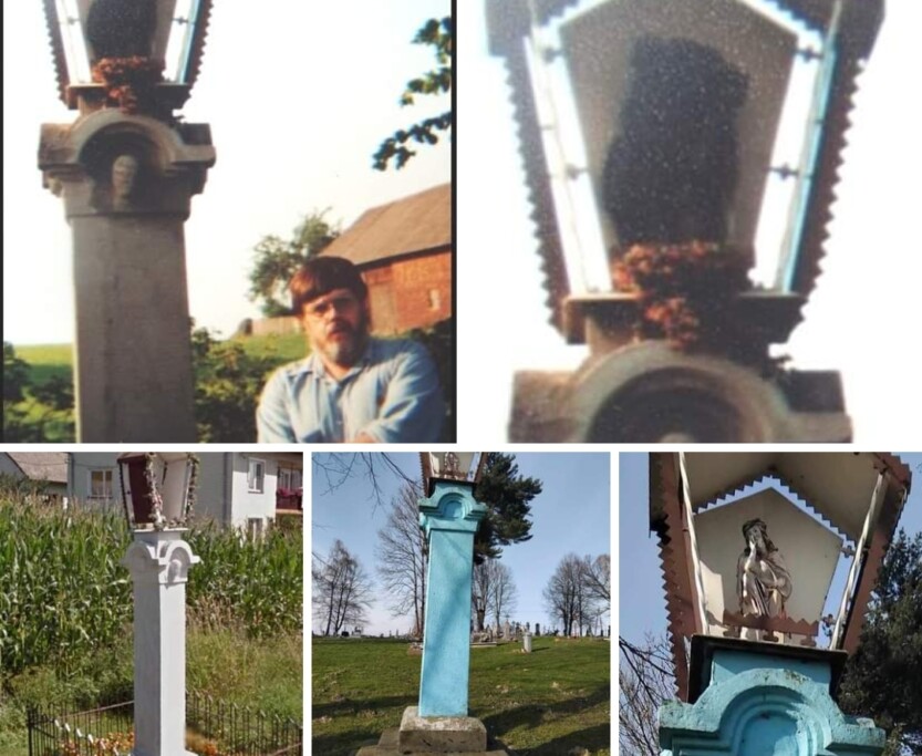 Jakieś 10 lat później, jadąc z Wadowic do Oświęcimia, zboczyłem z trasy, żeby odwiedzić moje dzieło. Chrystus został pieczołowicie obudowany i w sumie miewał się nieźle. Jak zacząłem kręcić się wokół teraz już kapliczki, z pobliskiego domu wyszedł zaniepokojony starszy gość, który poinformował mnie, że figurę wykonał artysta ze Śląska. Zrobiłem wtedy tylko jedno zdjęcie w dodatku bardzo kiepskie, czego dzisiaj bardzo żałuję. A tak przy okazji dodam, że ks. Tadeusz Porzycki okazał się być kolegą mojej siostry z wadowickiego liceum. Sama zaś kolumna z nie moim Chrystusem, przy okazji poszerzania za pieniądze Unii Europejskiej drogi, została przeniesiona na tamtejszy cmentarz. Może właśnie wtedy Chrystusa podgrandzono? Może nawet trafił do Brukseli, jako trofeum, ilustrujące skuteczność programów UE w walce z sakralizacją przestrzeni publicznej?